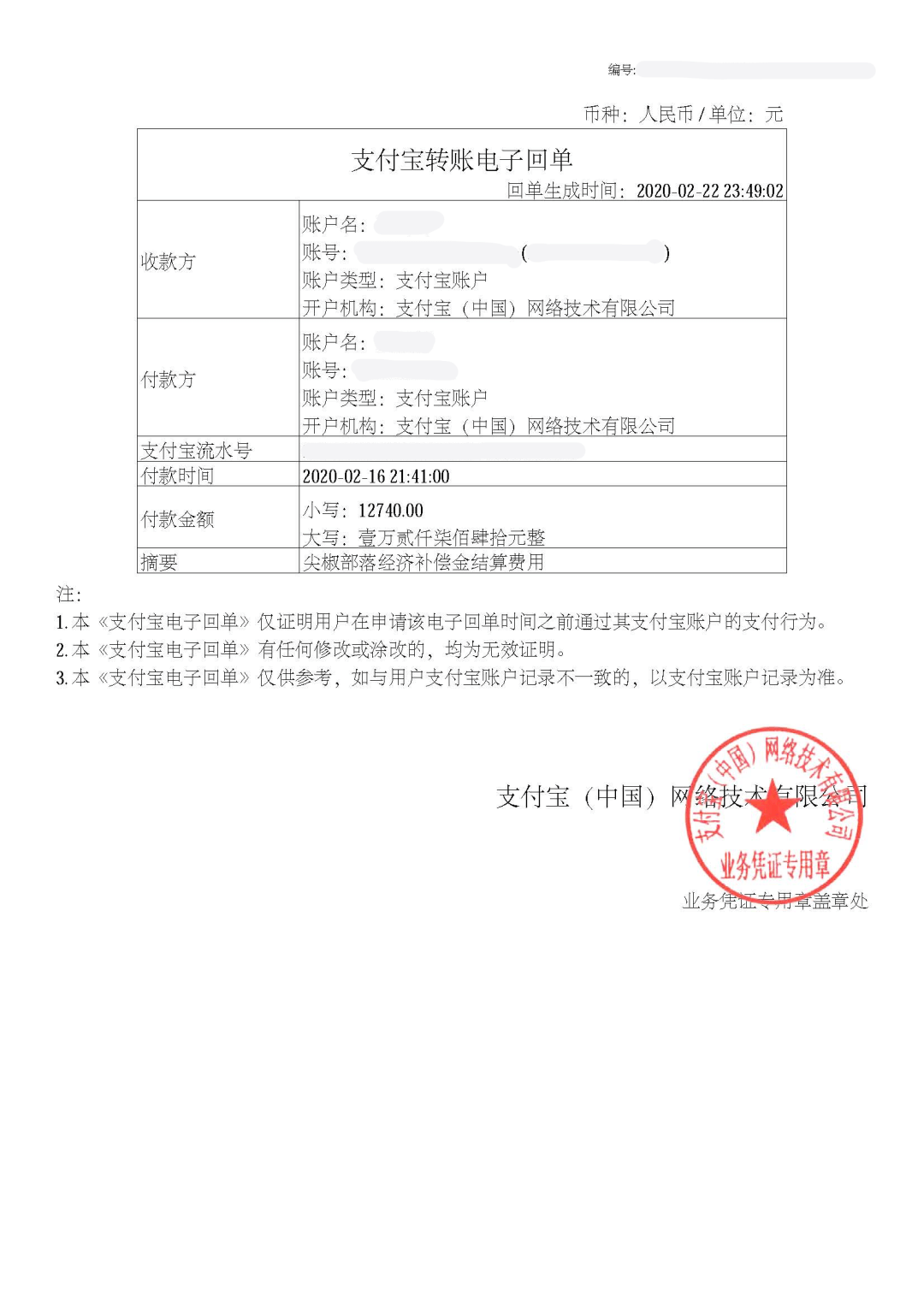 名称:支付宝转账电子回单
